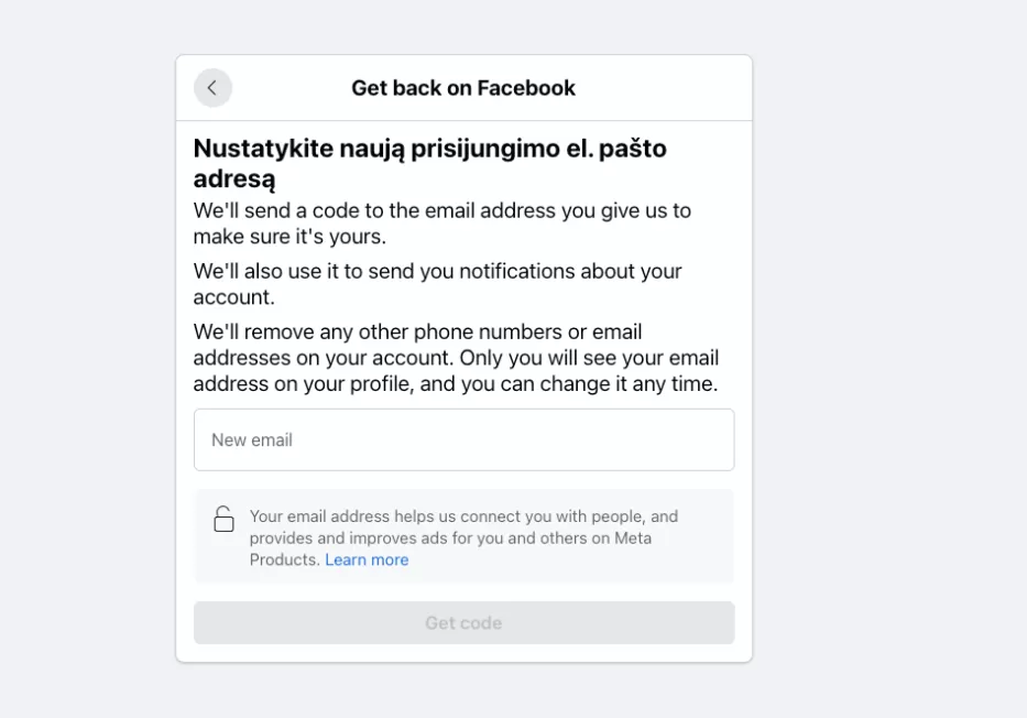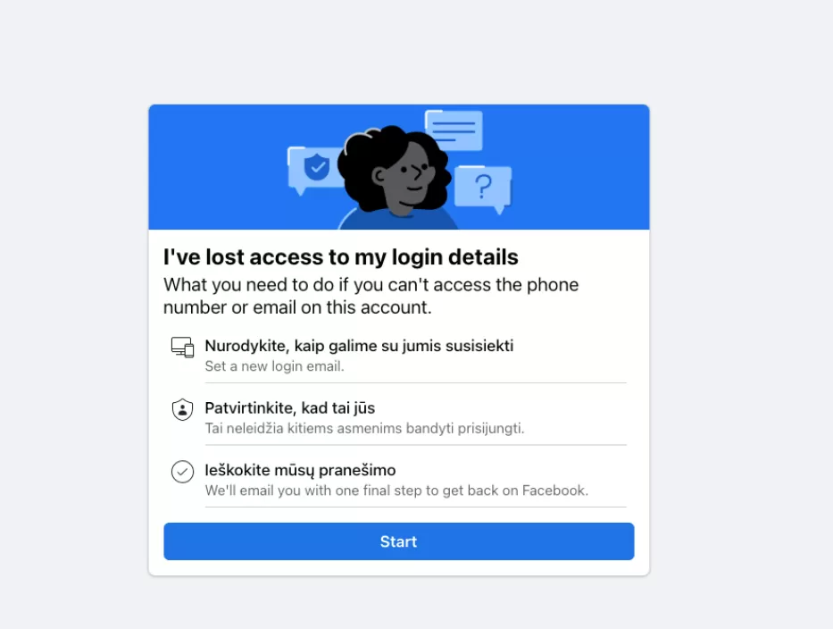 Jei negalite pasiekti savo el. pašto, telefono numerio ar kitos “Facebook” paskyroje esančios kontaktinės informacijos, galite pasinaudoti puslapio apačioje esančia nuoroda “Nebegalite pasiekti viso to?” (angl. No longer have access to these?) .