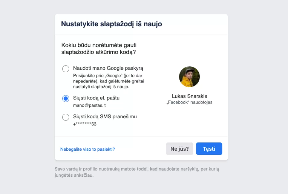 Kaip prisijungti prie „Facebook“ paskyros be slaptažodžio ir el. pašto?