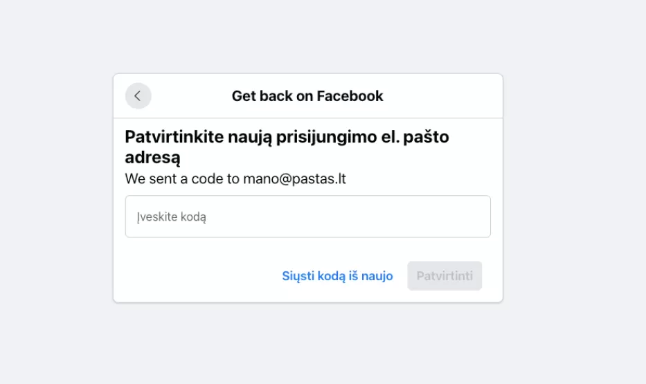Prisijungdami prie “Facebook” paskyros naudokite jums atsiųstą laikinąjį prisijungimo kodą.