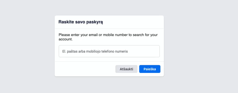 Spustelėkite šią nuorodą ir įveskite savo “Facebook” paskyros duomenis (el. pašto adresą arba telefono numerį). Pasirinkite “Ieškoti” (angl. Search), kad pamatytumėte visus būdus, kuriais galite prisijungti prie savo “Facebook” paskyros.