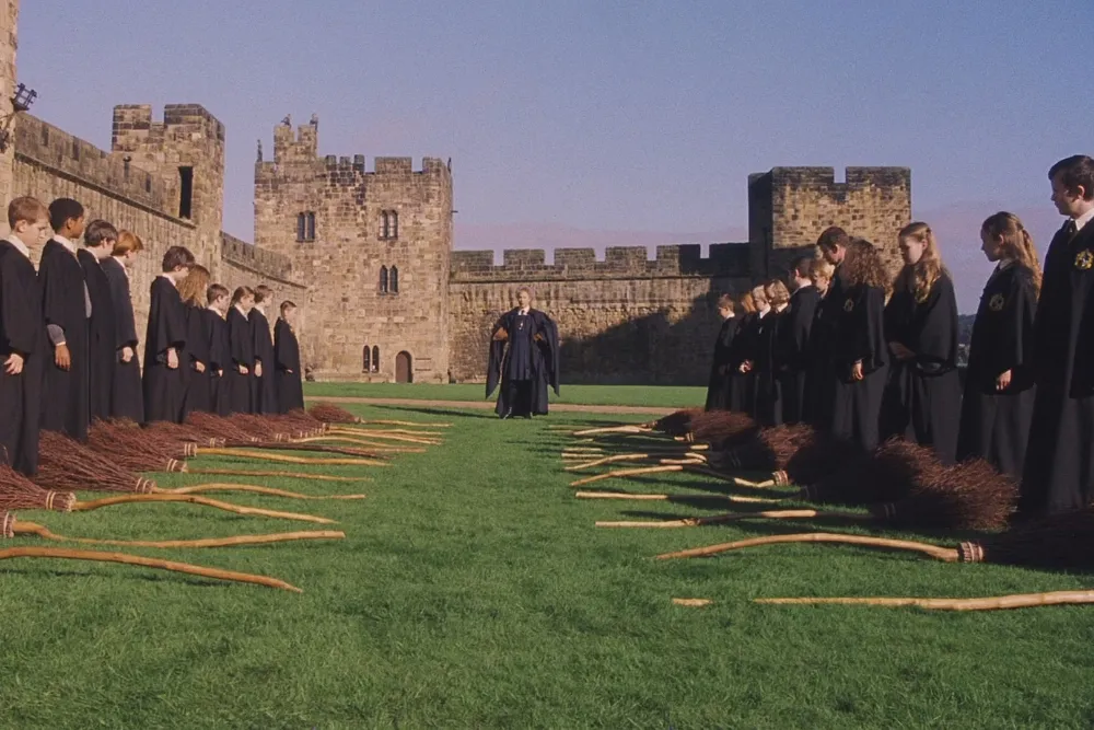 Hogvartso pirmakursiai mokosi skraidyti ant šluotų Alnviko pilies kieme. Šaltinis: “Haris Poteris ir filosofinis akmuo”, Warner Bros. Nuotraukos