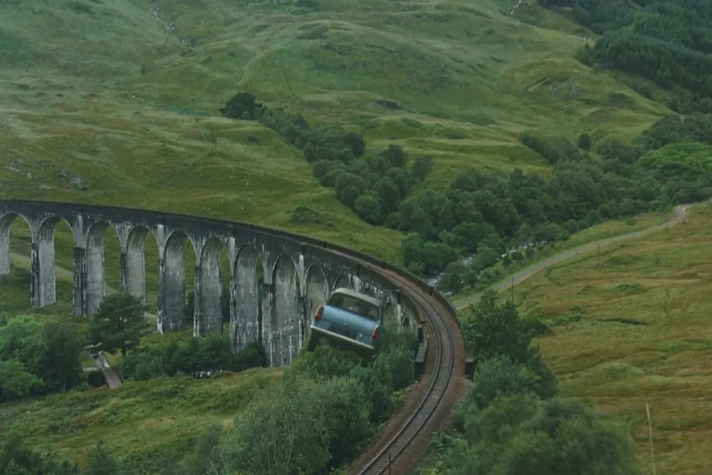 Traukinys važiuoja per viaduką ir filmo “Haris Poteris ir ugnies taurė” pradžioje. Vos po kelių sekundžių tolumoje kitu kampu pasirodo Hogvartsas.