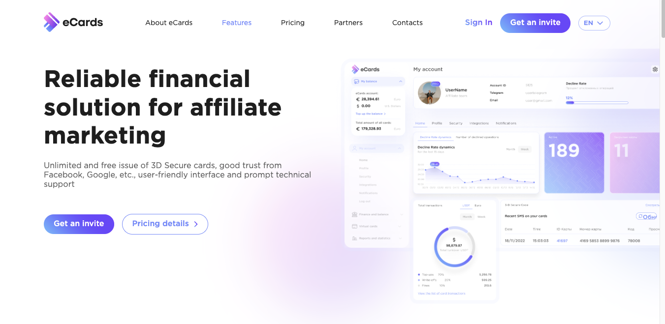 eCards išleidžia virtualias korteles reklamos apmokėjimui. Jos veikia su Visa, Mastercard ir UnionPay. Kortelių kiekis neribojamas, bet minimalus pildymas 500 dolerių. Reikia atsižvelgti į baudą už atmestas operacijas – iki 0,5 euro. Pildymo komisija nuo 4,5%.