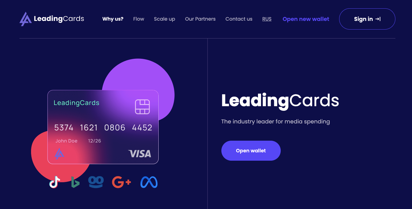 Leading Cards tinka agentūroms ir komandoms su globaliomis kampanijomis. Komisija už tarptautines transakcijas fiksuota – 2%. Pildymas galimas kriptovaliutomis.