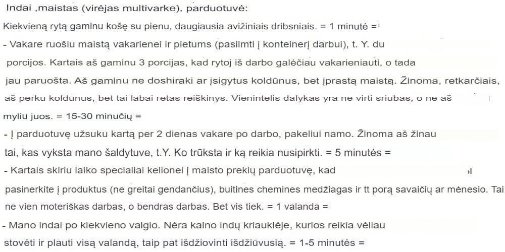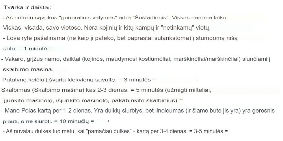 Susidūrėme su fantazijomis apie laiką. Ir dar yra namų ruošos darbų rezultatas. Ar įmanoma gyventi taip, kaip aprašo aukščiau esančio įrašo autorė? Žinoma, kas draudžia. Bet daugelis nebus patenkinti skalbdami patalynę su gatvės džinsais (ypač jei jie balti, o kelnės juodos), gamindami maistą daugiafunkcinėje viryklėje pagal principą “įmetė viską, kažkas išėjo”, plaudami grindis per 10 minučių, o tai veikiau reiškia “braukite skudurą matomose vietose”.