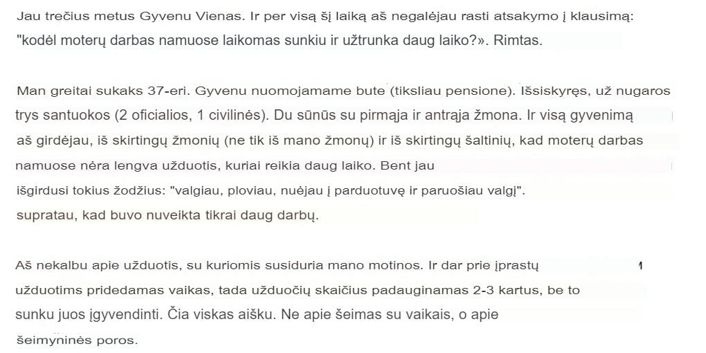 Taigi dažnai moteriai iš tiesų lengviau viską daryti pačiai, nei priminti, kontroliuoti, kovoti su sabotažo pasekmėmis. Nes tai taip pat yra darbas.