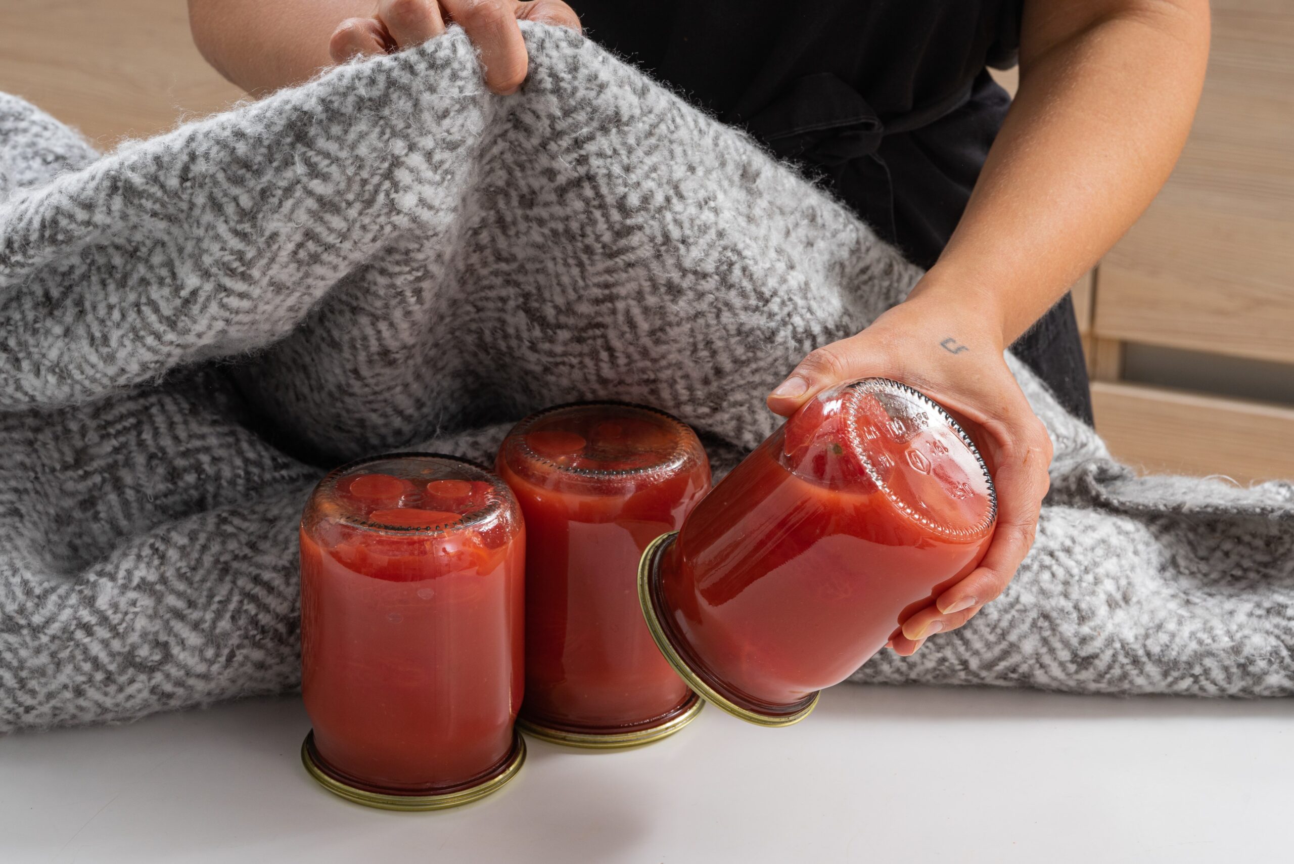Uždarykite stiklainius dangteliais, apverskite juos aukštyn kojomis ir uždenkite antklode, kol jie visiškai atvės. Šis metodas padeda sukurti vakuumą ir išsaugoti sultis.