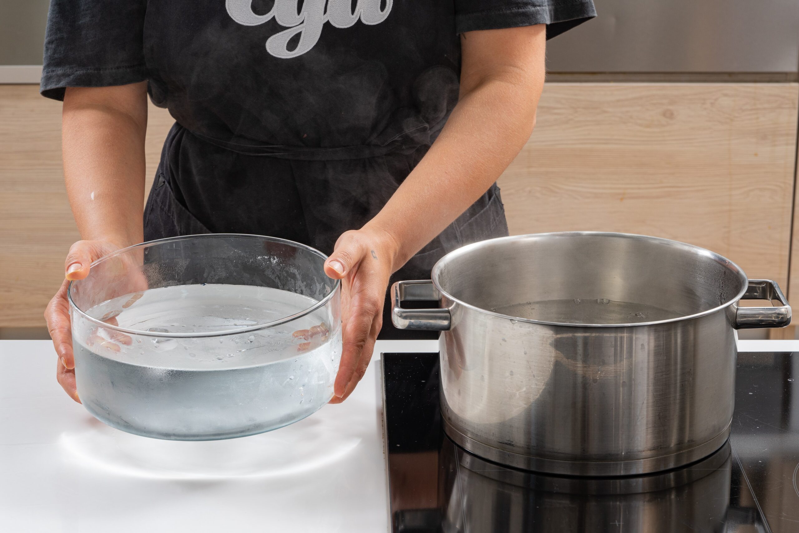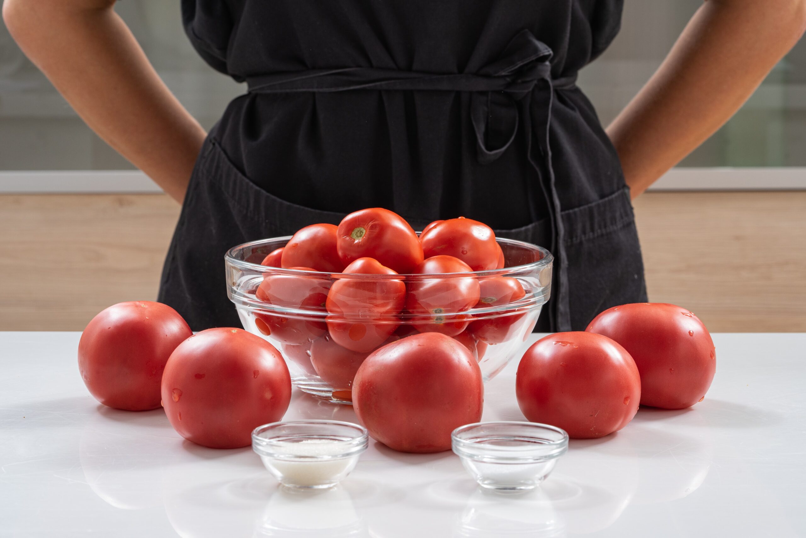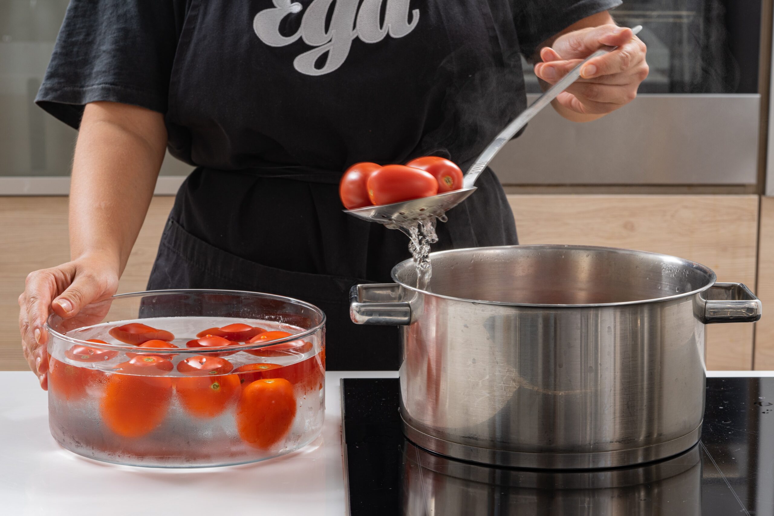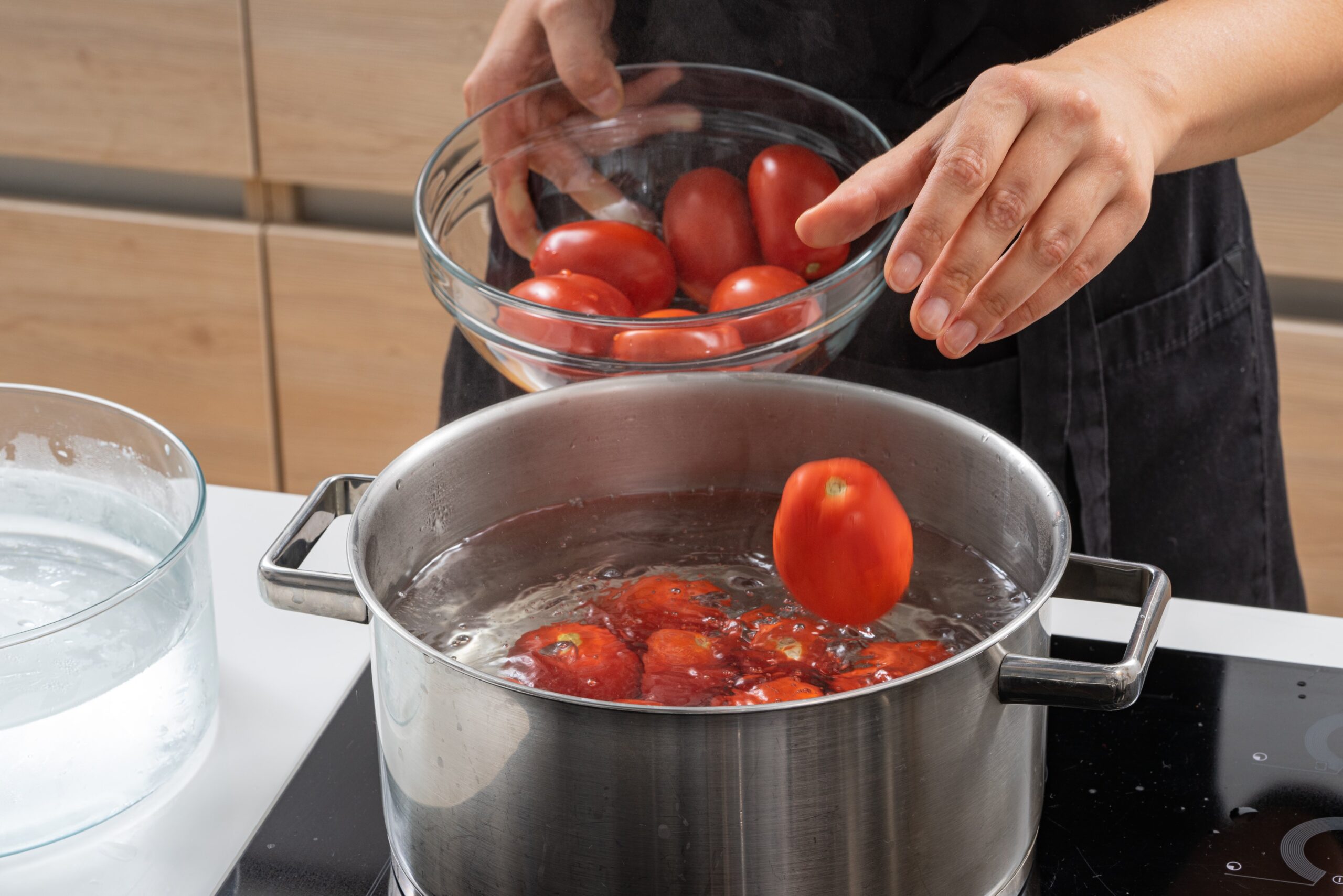 Dideliame puode užvirinkite vandenį ir paruoškite dubenį su lediniu vandeniu. Šis procesas padės greitai atvėsinti pomidorus po virimo, taip išsaugant jų tekstūrą.