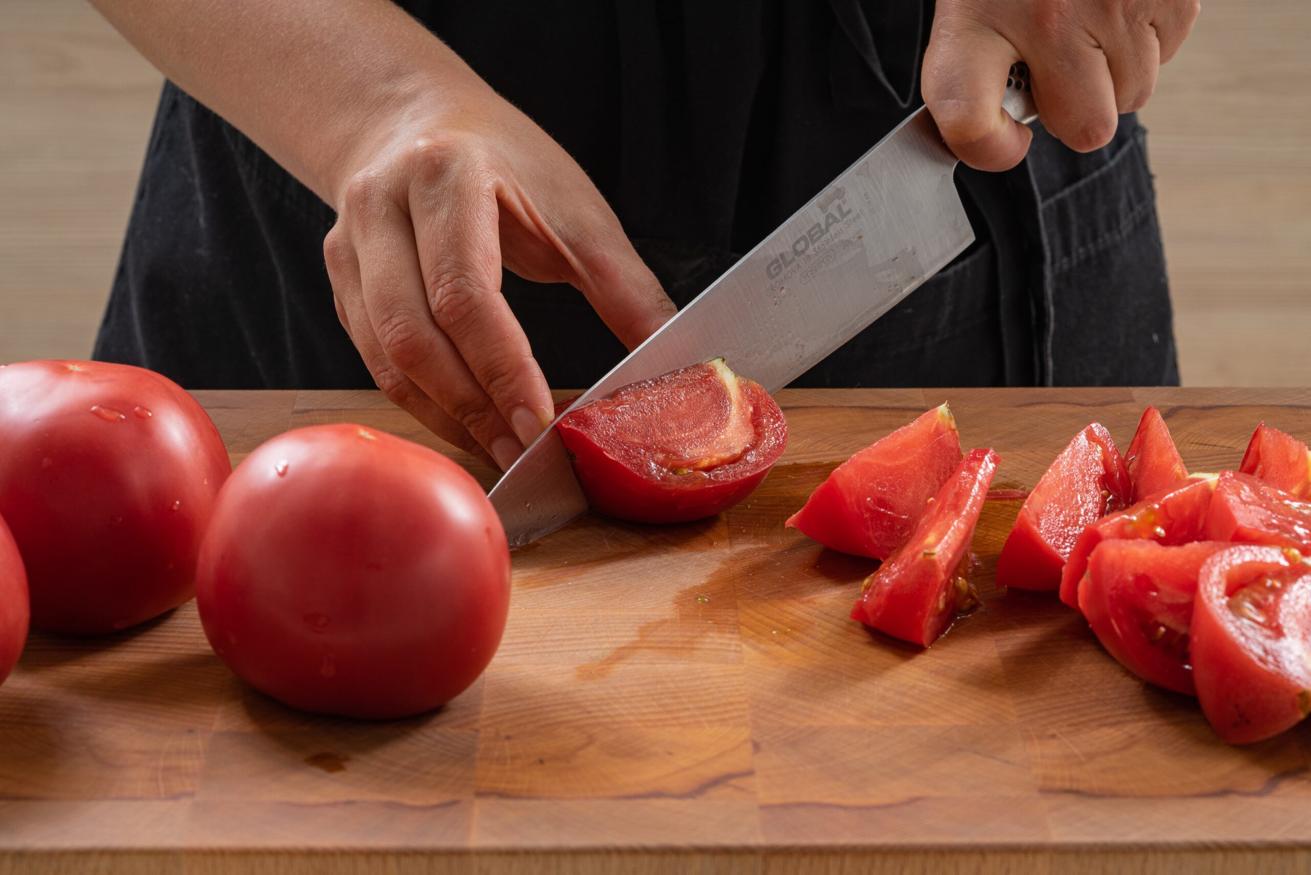 Į verdantį vandenį 30 sekundžių įdėkite slyvinius pomidorus. Blanširavimas padės lengvai nulupti odelę, todėl pomidorai bus paruošti naudojimui.