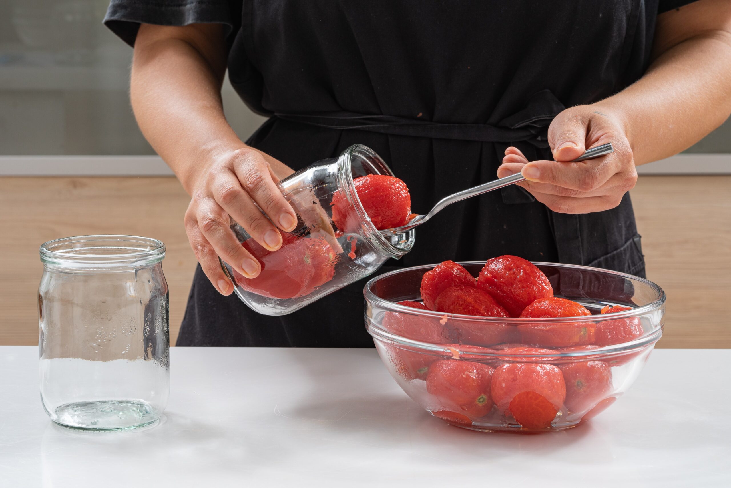 Nuluptus pomidorus perkelkite į sterilizuotus stiklainius ir užpilkite paruoštomis sultimis. Užtikrinkite, kad stiklainiai būtų pilni, kad išvengtumėte oro burbuliukų, kurie gali pakenkti sultims.