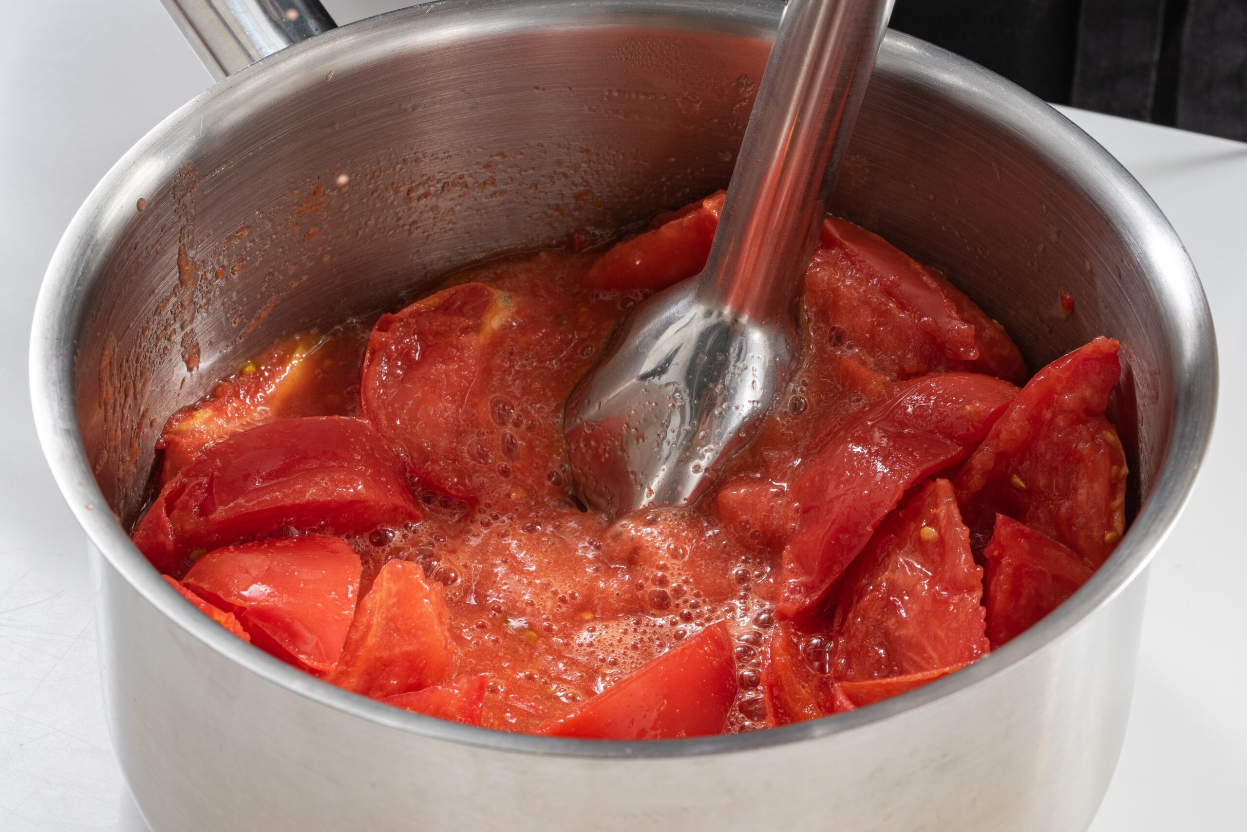 Kai pomidorai išskirs sultis ir užvirs, su blenderu sutrinkite masę iki vientisos konsistencijos. Šis žingsnis leis sultims tapti kreminėmis ir dar labiau išryškins jų skonį.