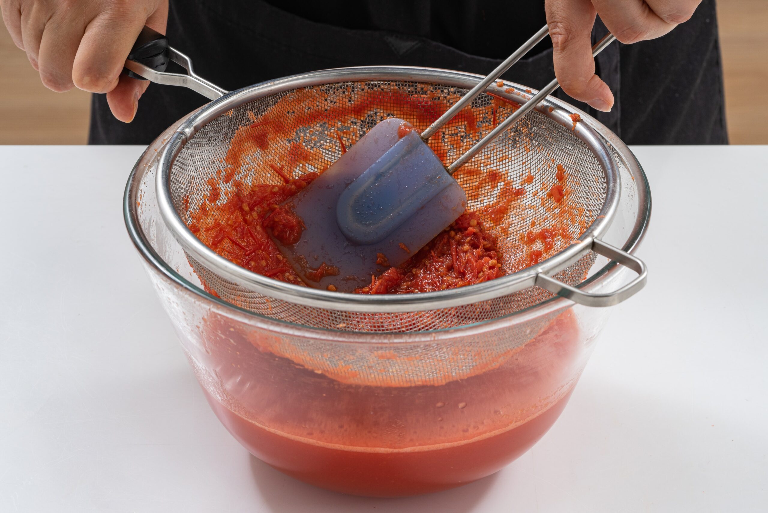 Pomidorų masę pertrinkite per sietelį, kad atsikratytumėte žievelių ir sėklų. Tai padės gauti sklandesnes ir malonesnes sultis, kurias galima naudoti įvairiuose patiekaluose.
