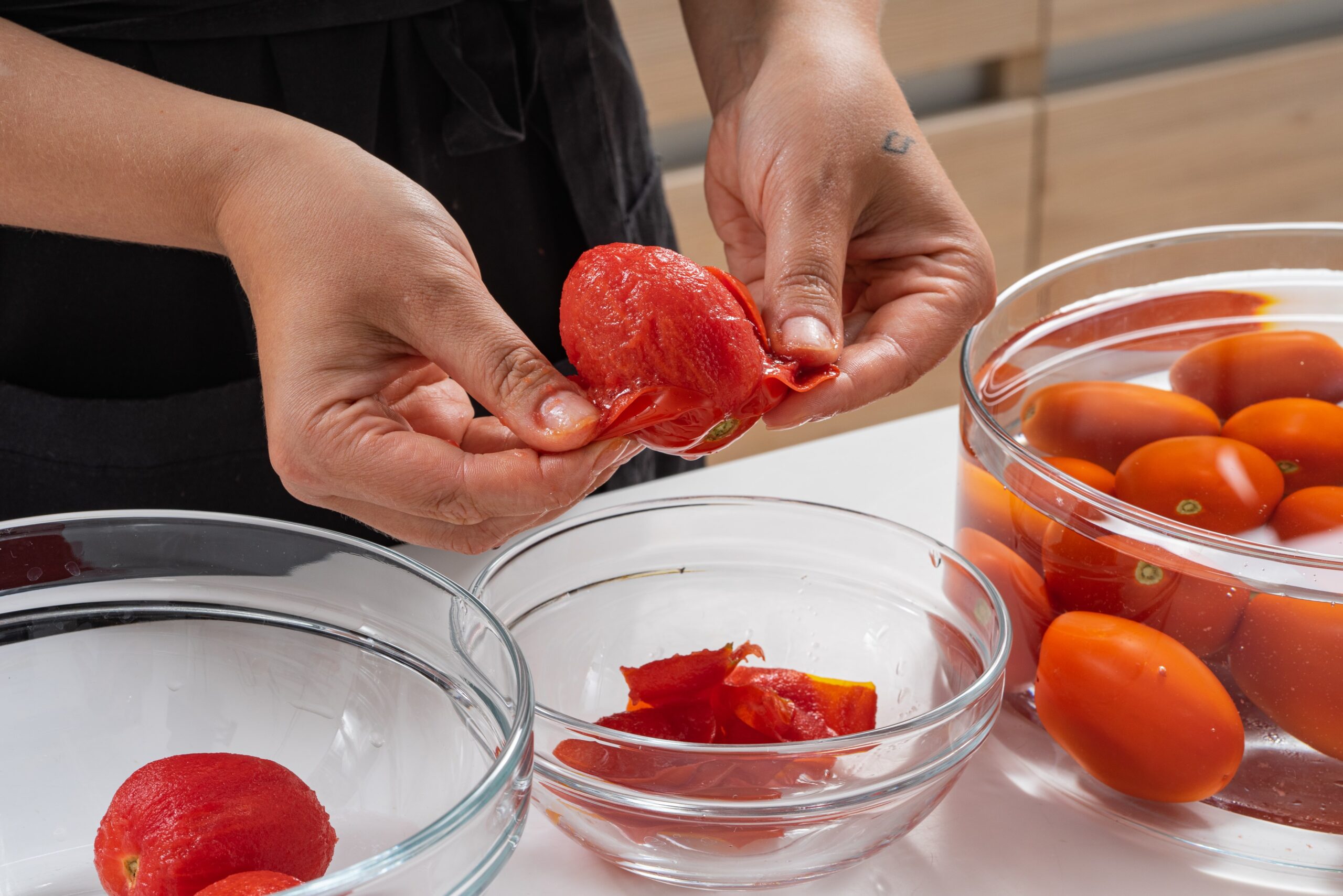Po blanširavimo perkelkite pomidorus į ledinį vandenį, kad sustabdytumėte virimo procesą. Tai taip pat padeda išsaugoti ryškią pomidorų spalvą.