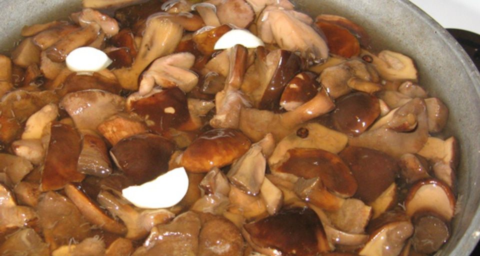 Į verdantį marinatą sudėkite grybus ir supjaustytą česnaką, leiskite užvirti, sumažinkite ugnį ir virkite 10 minučių. Pabaigoje supilkite actą, gerai išmaišykite ir nedelsdami sudėkite į stiklainius. Uždenkite, apverskite aukštyn kojomis ir palikite atvėsti.