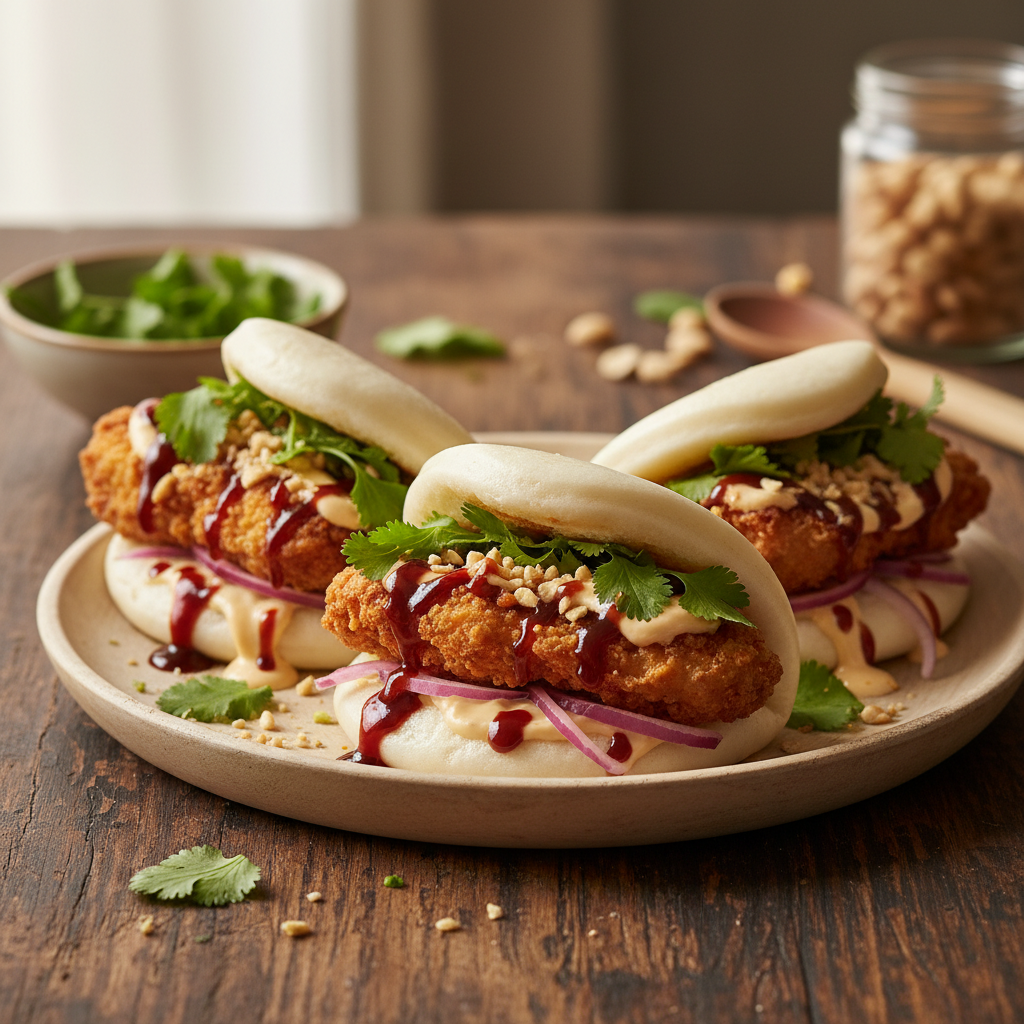 Pateikite didelį dubenį garuojančių bandelių (jas galite laikyti šiltai garpuodyje ant stalo). Atskirose lėkštėse išdėliokite keptą vištieną, plėšytą kiaulieną ar traškų tofu. Paruoškite mažus dubenėlius su įvairiais priedais: smulkintais svogūnų laiškais, kepintais sezamais, marinuotais raudonaisiais svogūnais, kimchi kopūstais, smulkintu čili pipiru. Nepamirškite padažų įvairovės – nuo tradicinio Hoisin ir teriyaki iki saldaus čili ar žemės riešutų padažo.