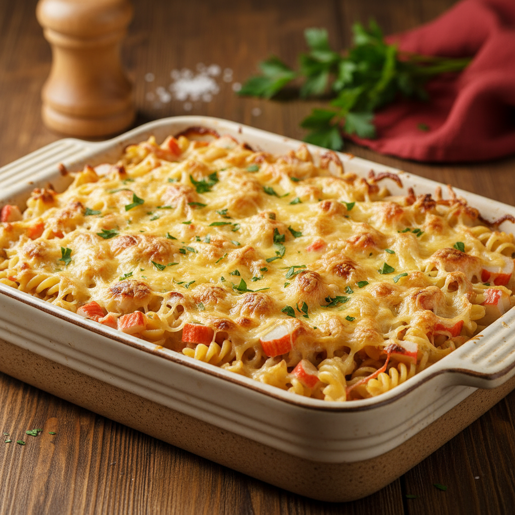 Kai norisi tikro jaukumo maisto (angl. comfort food), orkaitėje kepti apkepai yra nepakeičiamas pasirinkimas. Makaronų ir krabų lazdelių apkepas yra ypatingai sotus, sušildantis ir labai lengvai paruošiamas. Šiame patiekale krabų lazdelių saldumas tobulai persipina su kreminiu grietinėlės ir sūrio padažu, sukuriant prabangų skonį iš labai paprastų ir pigių ingredientų. Toks apkepas puikiai tiks gausiai šeimos vakarienei. Pasiruošimas užtrunka vos dešimt minučių, o visą likusį darbą už jus nudirbs orkaitė. Be to, šiam receptui galima sunaudoti bet kokius spintelėje užsilikusius trumpus makaronus – sraigtelius, vamzdelius ar kaspinėlius.