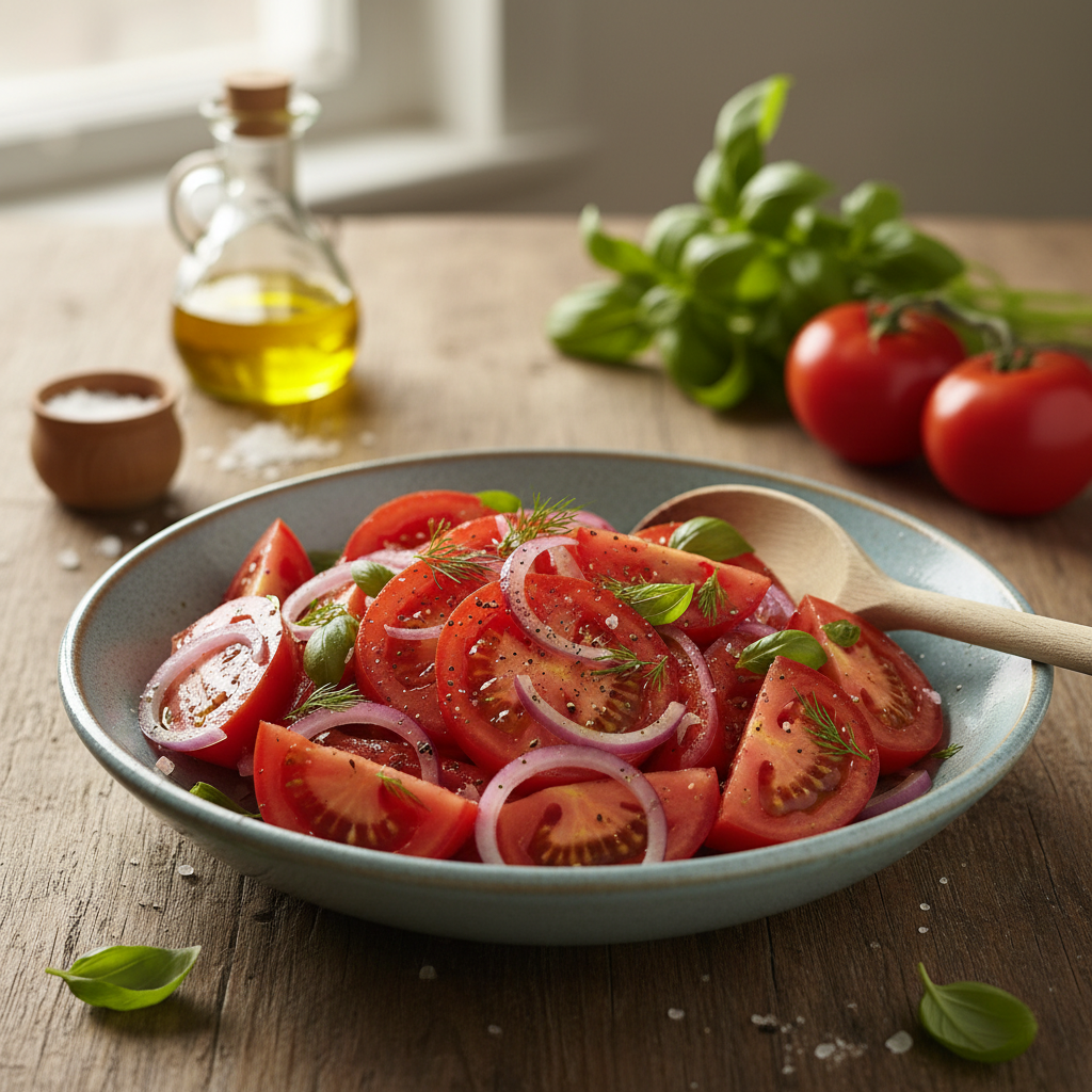 Vasara – tai metas, kai norisi lengvų, gaivių ir kvapnių patiekalų, kurie suteikia energijos ir neapsunkina. Vienas iš tokių patiekalų – paprastas, bet nepaprastai skanus pomidorų su svogūnais receptas. Šis patiekalas tinka ne tik prie pagrindinių patiekalų, bet ir kaip savarankiškas užkandis, ypač karštomis dienomis. Jo paprastumas, šviežumas ir spalvų žaismas ant stalo džiugina tiek akis, tiek skonio receptorius. Tad jei norite pagyvinti savo vasaros meniu, šis receptas tikrai pravers kiekvienam.