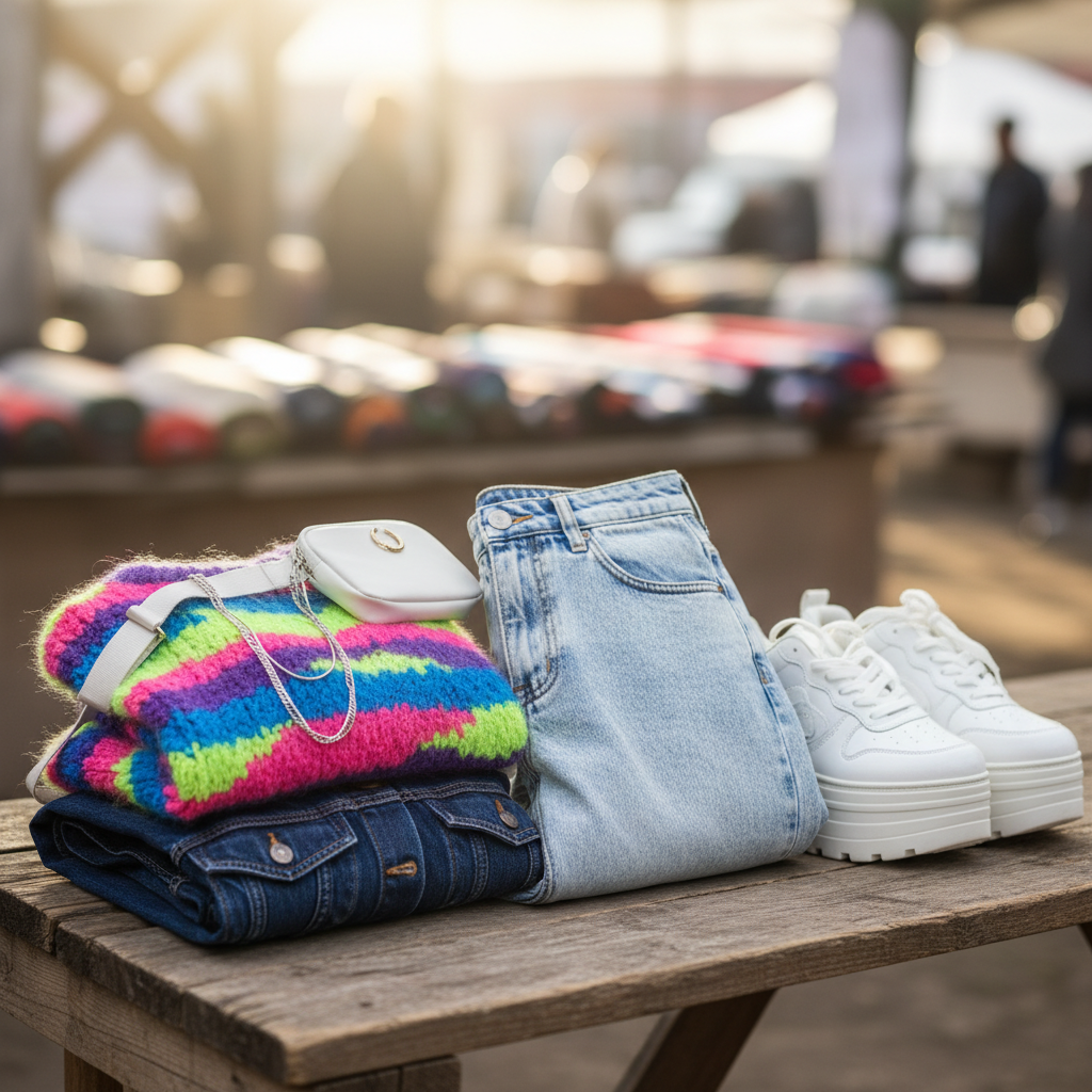 - Dideli megztiniai: Ypač populiarūs buvo pūkuoti angoros vilnos megztiniai, neretai puošti karoliukais ar aplikacijomis. Taip pat kultiniu tapo „BOYS“ megztinis – platus, unisex stiliaus drabužis, kurį nešiojo tiek vaikinai, tiek merginos.
